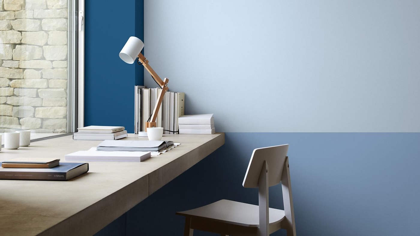 Dans un bureau avec fenêtre, vous profiterez au maximum de la vue et de la lumière tout au long de la journée. Piquez la curiosité en peignant les murs dans différentes nuances d’une même couleur. Un camaïeu bleu apportera un sentiment de quiétude et de la personnalité à la pièce, parfait pour éveiller la créativité.